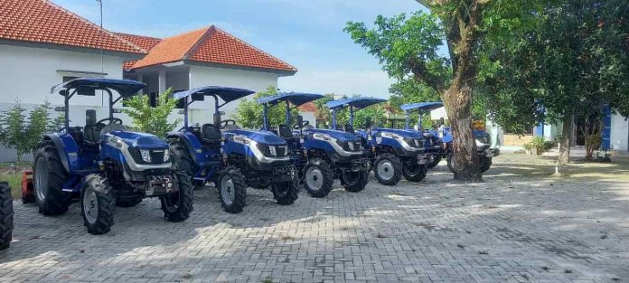 Ditempatkan di halaman Kantor Kecamatan Kesamben 6 Kelompok Brigade Pangan Kecamatan Kesamben mendapat kiriman bantuan alat pertanian 6 traktor roda 4 dan 6 rotavator.